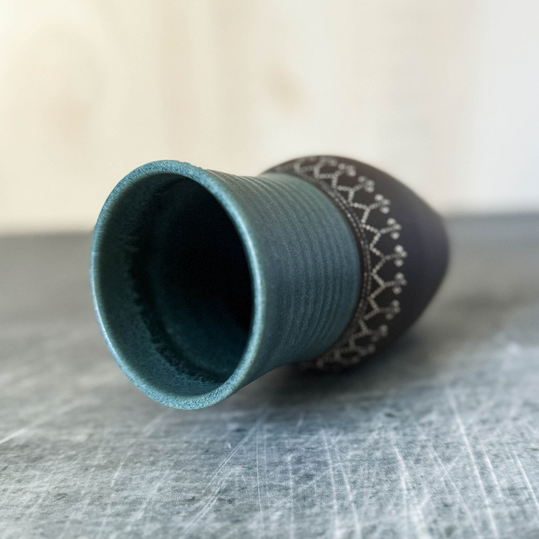 The motif of this tall tumbler echoes old world architectural elements using ancient Baltic stamping motifs from ceramics, leather and jewelry. The burnished clay exterior is carved and stamped then inlaid with white slip. It’s glazed inside, and we dip the neck for a smooth grip. Perfect for long drinks or mocktails.